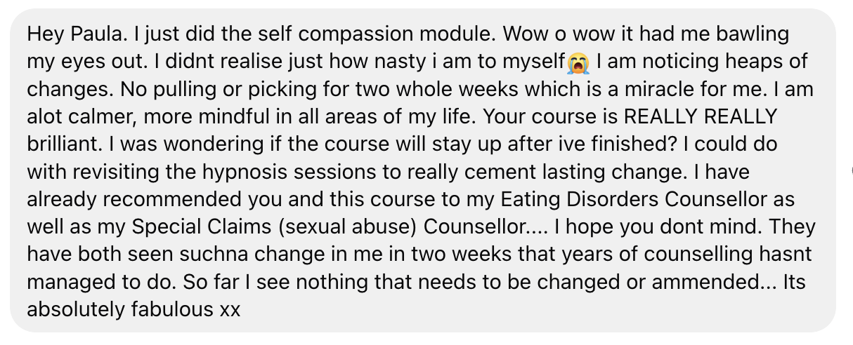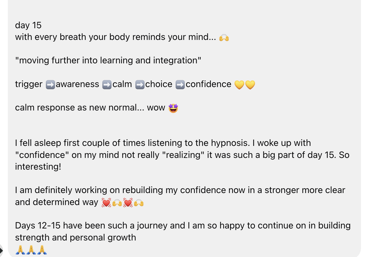 “Wow Paula, this is really great. Ive listened to so many hypnosis audios and I’ve not been introduced to this level of information and helpful. Understanding my issues on a level that makes sense to me.”